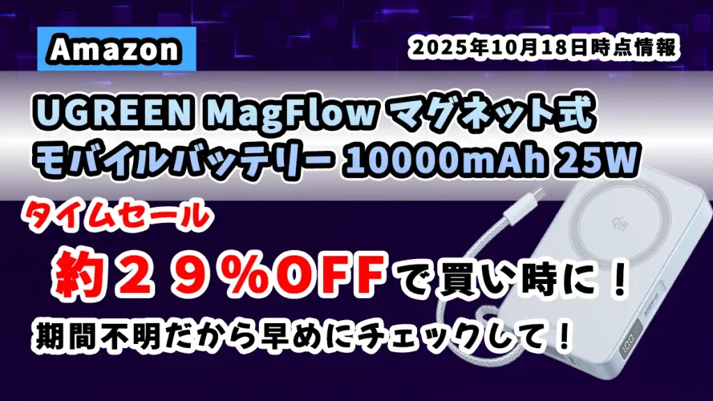 UGREEN MagFlow Qi2 25W マグネット式モバイルバッテリーがタイムセール中【Amazon】Qi2認証の高速充電&マグネット式で持ち運びも便利【2025年10月18日時点情報】