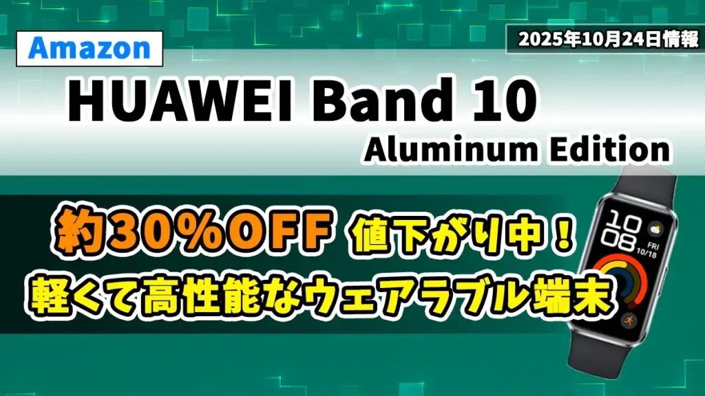 【Amazonで値下げ】HUAWEI Band 10 Aluminum Editionが約6,100円に!軽量アルミボディと高精度AIヘルス管理が魅力【2025年10月24日情報】